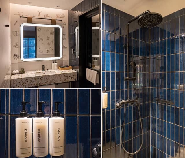 カラフルな洗面台は端材を利用したサステナブル素材で、大きなライティングミラーを備えます。水回りは全室シャワーブースですが、スイートルームには他の客室にはないレインシャワーを備えます。ソープ類は今まで使ったことのない「APOTHEKE(アポテーケ)」で、ココナツやアロエなど保湿力のある天然成分を配合する、ニューヨーク・ブルックリン発のブランドです。