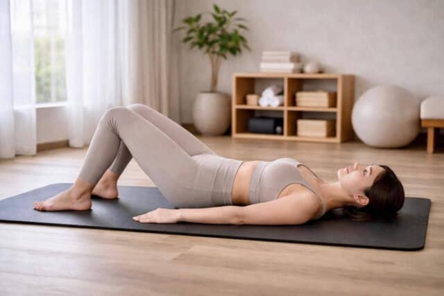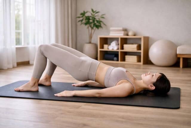 息を吸って準備し、吐きながら両足でマットを押します。お尻をゆっくり持ち上げ、肩からひざまでが一直線になる位置でストップ。腰を反らすのではなく、お尻を上へ持ち上げる意識で。2〜3呼吸ほどキープします。
