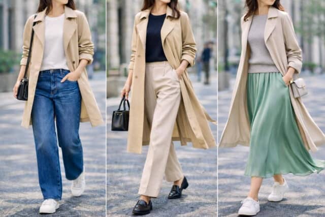 ▲ベルトを締めすぎない、少しゆとりのあるシルエット、カジュアル要素を少し足す。この3つを意識するだけで、トレンチコーデは今シーズンのバランスに整う