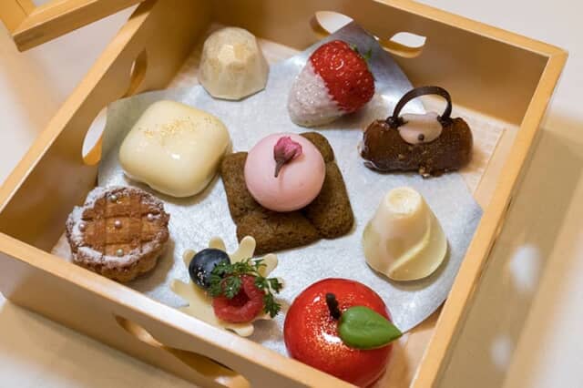 箱根仙石原プリンスホテル[レストラン グリル]の「春色箱根旅~きらめきスイーツボックス (フリードリンク付)~」(¥3,000)は、木箱の中に桜のムースや富士山の形をしたパルフェに加え、湘南ゴールドのムースや箱根山麓紅茶のフィナンシェなど “地域の味” も楽しめます。