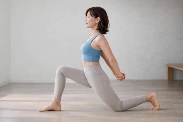 片脚のひざを床につき、もう片脚を前に出してひざを立てます。両ひざはそれぞれ直角に。骨盤を立て、背筋を上へ伸ばし、両手を体の後ろで軽く組みましょう。肩は力を抜いて下げておきます。