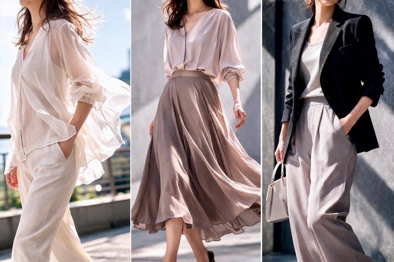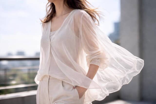 まず押さえておきたいのが、透け感のあるシアー素材。シャツやトップスに取り入れるだけで、コーディネートに抜け感が生まれます。肌を見せすぎるのが気になる場合は、インナーを同系色でまとめると落ち着いた印象に整います。
