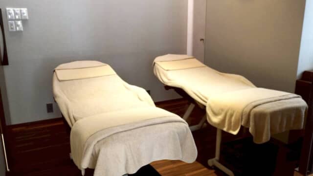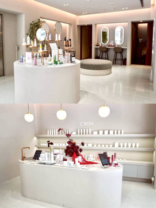 ▲開放感のあるラウンジスペースや、フェイシャリストシリーズなどスキンケアアイテムが並んだスペースもあります。奥にはペアルームを完備