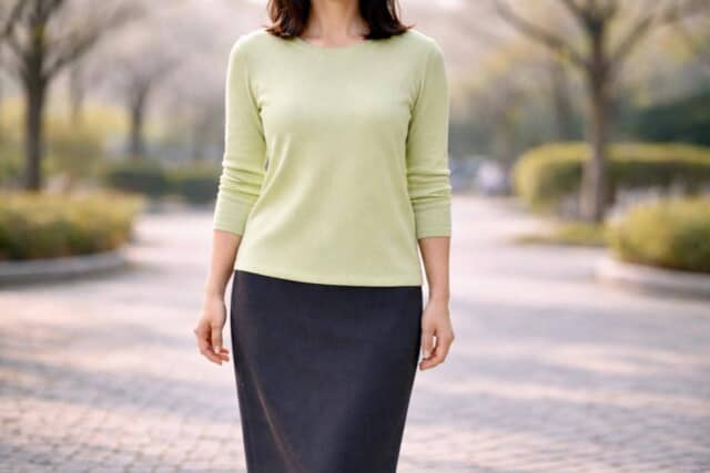 解決策は至ってシンプル。前だけ軽くインする、ベルトでウエスト位置を示す、ショート丈の羽織りで上半身を区切るだけでOKです。大切なのは、腰の位置を視覚的に示すこと。