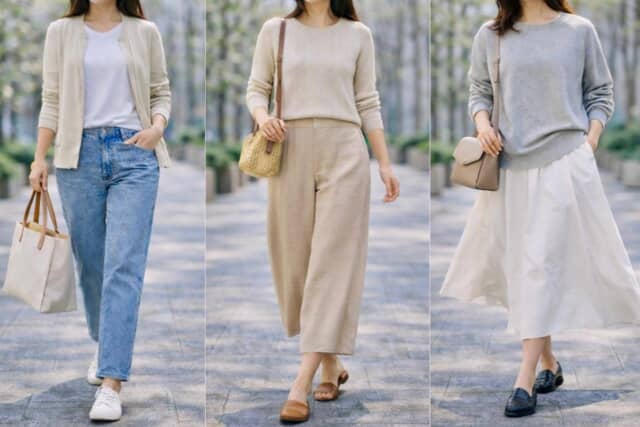 例えば、柔らかなニットに軽いジャケット、落ち感のあるボトムを合わせるなど、質感の違いを少しだけ作ることがポイント。同じ色味でまとめても、素材が変わることで立体感が生まれます。