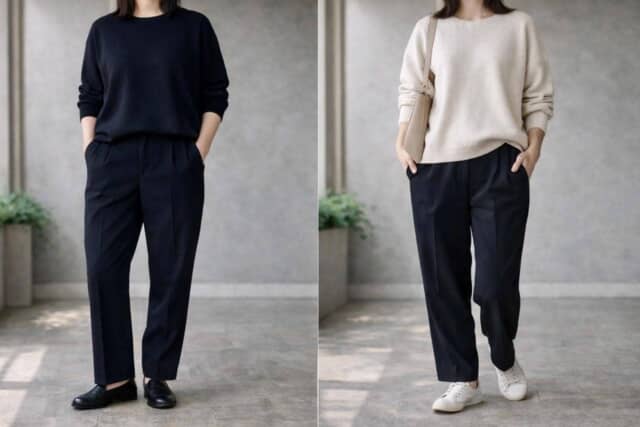 特に素材やシルエットに変化がない場合は、のっぺりとした印象に見えがち。黒は「足せば整う色」ではなく、「どこに置くか」で印象が変わる色と捉えるのがポイントです。