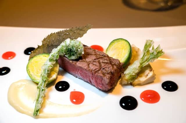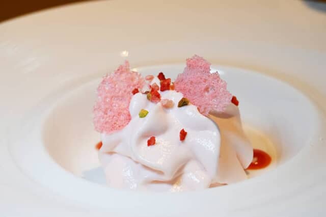 グリルした和牛のフィレ肉は脂身も控え目で、バルサミコソースとほんのり甘い桜のソース、さらにタケノコのピューレの3種類の味付けで楽しめます。付け合わせには、こごみやタラの芽、芽キャベツなど春の芽生えを象徴する野菜が添えられ、驚いたことに桜の葉も加わって、日本人にはなじみ深い風味が口の中に広がります。和牛と共に “春の味” を満喫しました。