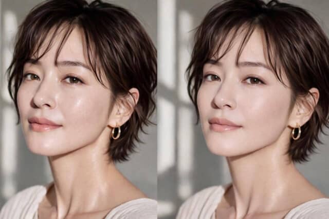 ▲ツヤとマット、印象を分けるのは“質感の置き方”。同じ顔でも、光の入り方でここまで変わる