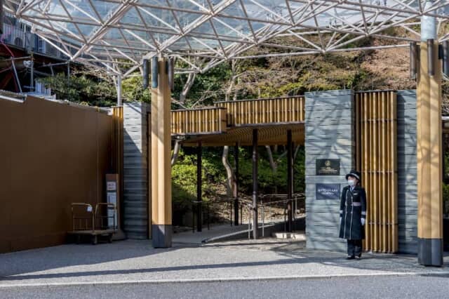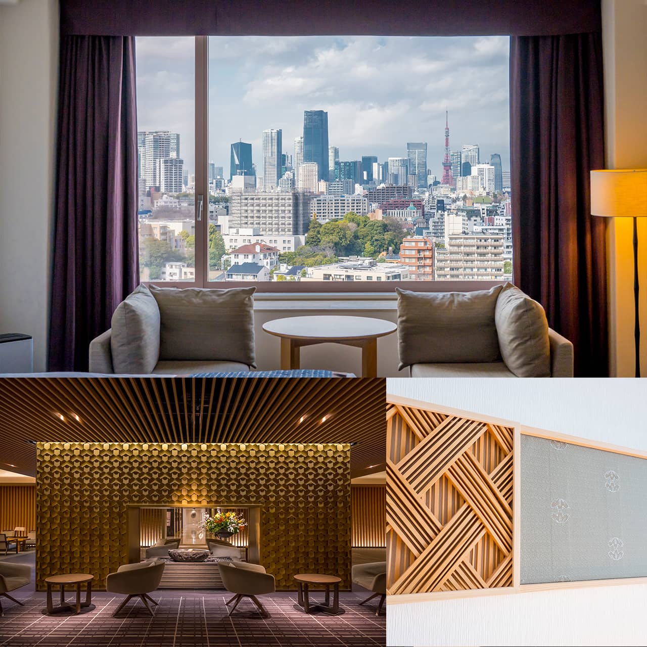 高輪は明治維新後に皇族や政財界人の邸宅地となり、今も住宅やマンションが立ち並ぶ高級住宅地。ホテルのエントランスは石材と格子を施し、邸宅の入口を思わせるデザインです。制服に身を包んだベルスタッフの姿に、上質なホテルステイの期待が高まります。