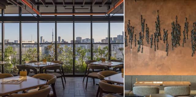 美しい東京景とともに朝食を満喫。広々とした窓からは空と摩天楼が織りなすスカイラインと共に東京スカイツリーⓇもよく見えます。レストランの壁には薪火のユラユラやメラメラをモチーフに、鉄で表現したアートワークが飾られていました。