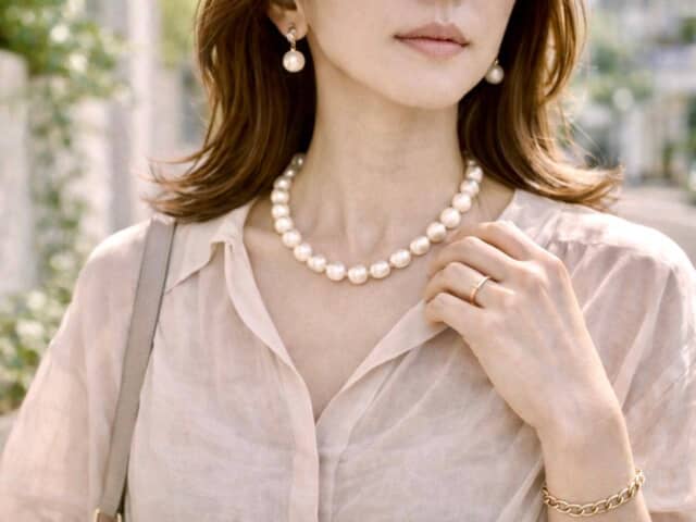一方で今は、同じパールでも“少しだけ抜けた見え方”がポイント。粒の大きさを少し抑えたり、均一すぎないものを選ぶことで、自然と軽さが出ます。目立たせるというより、“なじませながら効かせる”。このバランスが、今の空気感です。