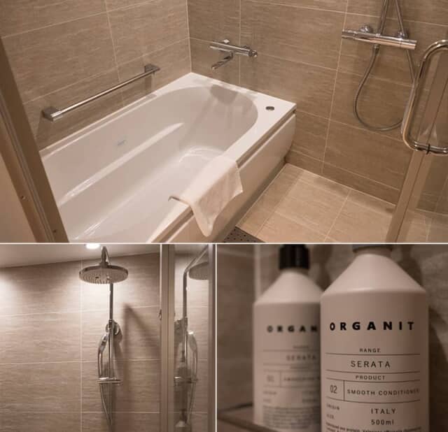 スーペリア以外の客室はバスタブ付き。バスアメニティは、植物由来の原料を使ったイタリアのブランド「ORGANIT(オルガニ)」のセラータで、シャンプーとコンディショナーはサッパリとした仕上がり、ボディソープはしっとり系の肌触り。ボタニカル系のスッキリとした香りでした。