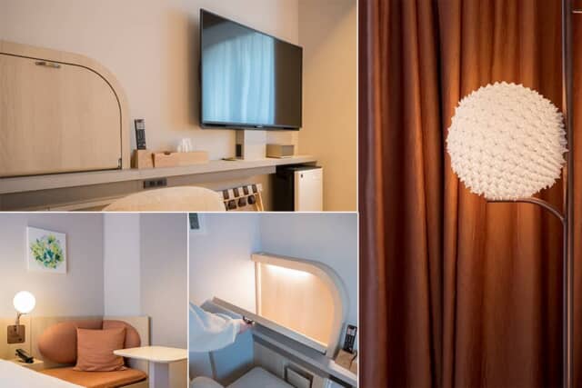 デスクは収納式で、使わないときは天板をしまえるので部屋を広く使えます。全ての客室に用意されるフロアランプとベッドサイドランプの球形の傘は江戸時代から名古屋に伝わる絞り染めの「有松・鳴海絞り」。手作業で作られていて、温もりのある独特の陰影で客室を照らします。