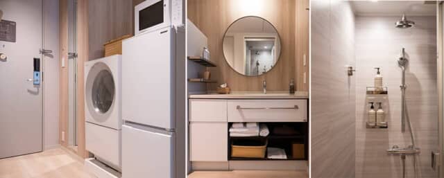 「スーペリアクイーン」は洗面、冷凍冷蔵庫、洗濯乾燥機が横並びに配置され、冷蔵庫から出した食材を洗ったりレンジで温めたりと、使い勝手よく配置しています。スーペリアタイプの客室はバスタブがなく、レインシャワー付きのシャワーブースです。