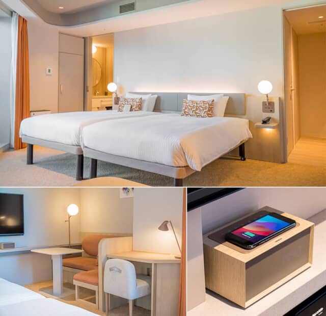 アメリカ・サータ社製のベッドは幅123cm × 長さ196cmで、2台繋げたハリウッドツイン仕様。コンパクトなベンチとデスクも用意され、パソコン作業に役立ちます。客室に用意されたスピーカーはスイスGENEVA TIME DIGITAL社の「デジタルクロック Qi充電機能付きBluetoothスピーカー」で、上にアイフォンを置くと充電ができる優れモノです。