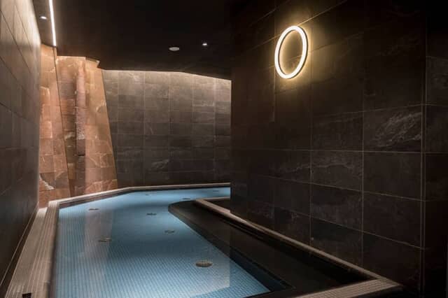 湯船はL字型をした珍しい形で、入り口は手前と奥に1カ所ずつあります。地中にある地下岩塩をイメージした壁が間接照明に照らされ、ヒーリング音楽が流れるスピリチュアルな雰囲気は、都心にいることを忘れてしまうほど新感覚のお風呂体験です。