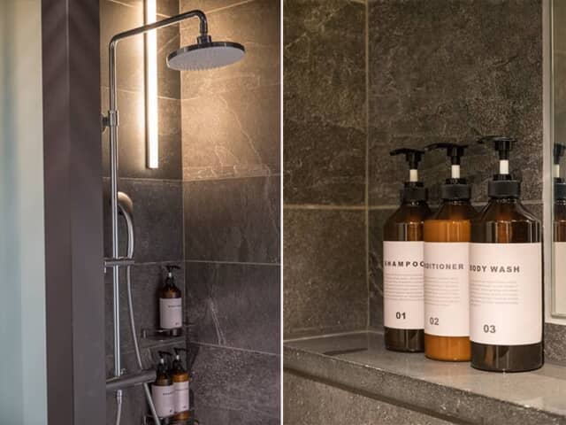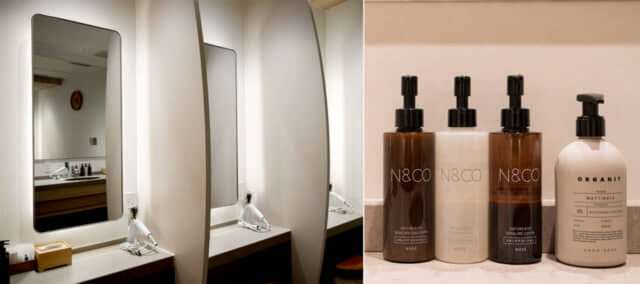 銀座エリアは外国人旅行者も多いことから、シャワーブースはレインシャワーつきのスタンディングタイプがメイン。腰掛けて使うのは男女それぞれ1箇所ずつです。それぞれ半個室タイプに仕切られていて、プライベート感もありました。バスアメニティーは客室と同じ「ORGANIT(オルガニ)」のセラータです。