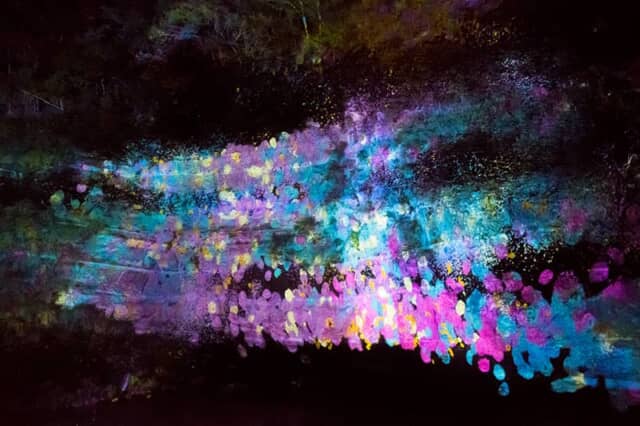 はじめに出会うのは養老渓谷の高い岸壁に映し出される巨大な情景です。花々が生まれ、時と時に朽ちていき、再び違う花が咲く、を永遠に移ろい続ける作品です。川岸に降りて見上げると、色鮮やかな色彩とその大きさは圧巻の迫力です。