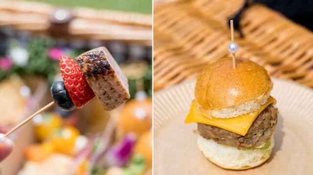 ▲「鴨の燻製ピンチョス」と「ミニチーズバーガー」