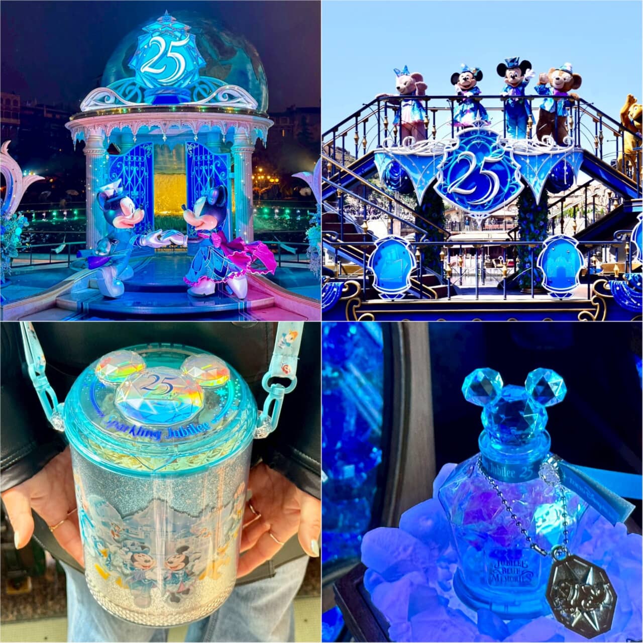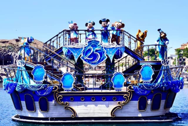 まず押さえたいのは、25周年の世界観を最も体感できるショー。メディテレーニアンハーバーで開催されている「スパークリング・ジュビリー・セレブレーション」では、ジュビリーブルーの衣装をまとったキャラクターたちが華やかなバージに乗って登場します。