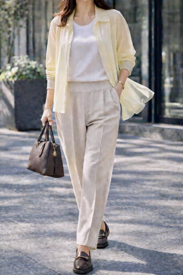 ▲足元をローファーに変えるだけで、軽さと抜け感が生まれ、印象がすっきり整う