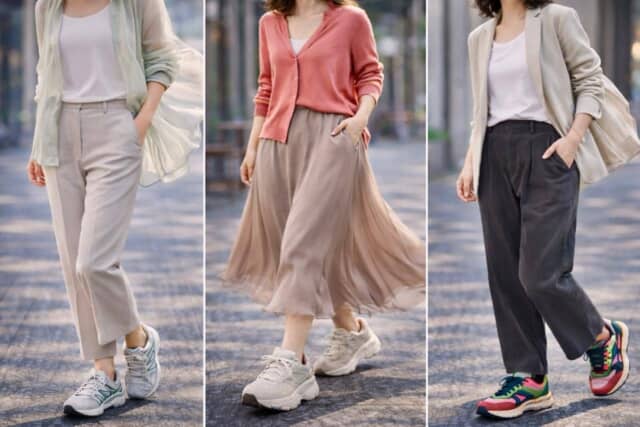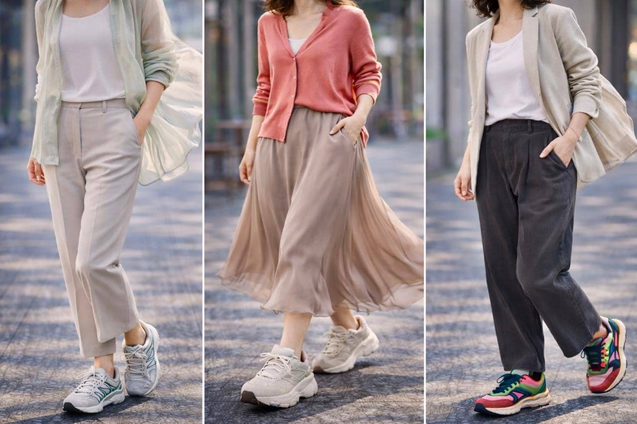 コーデ全体がニュートラルで整っているのに、スニーカーだけ配色が強いと、一気に浮いた印象に。黒×ピンクや多色使いのデザインは、それ自体が悪いわけではありませんが、今のトーンとはズレやすい要素です。