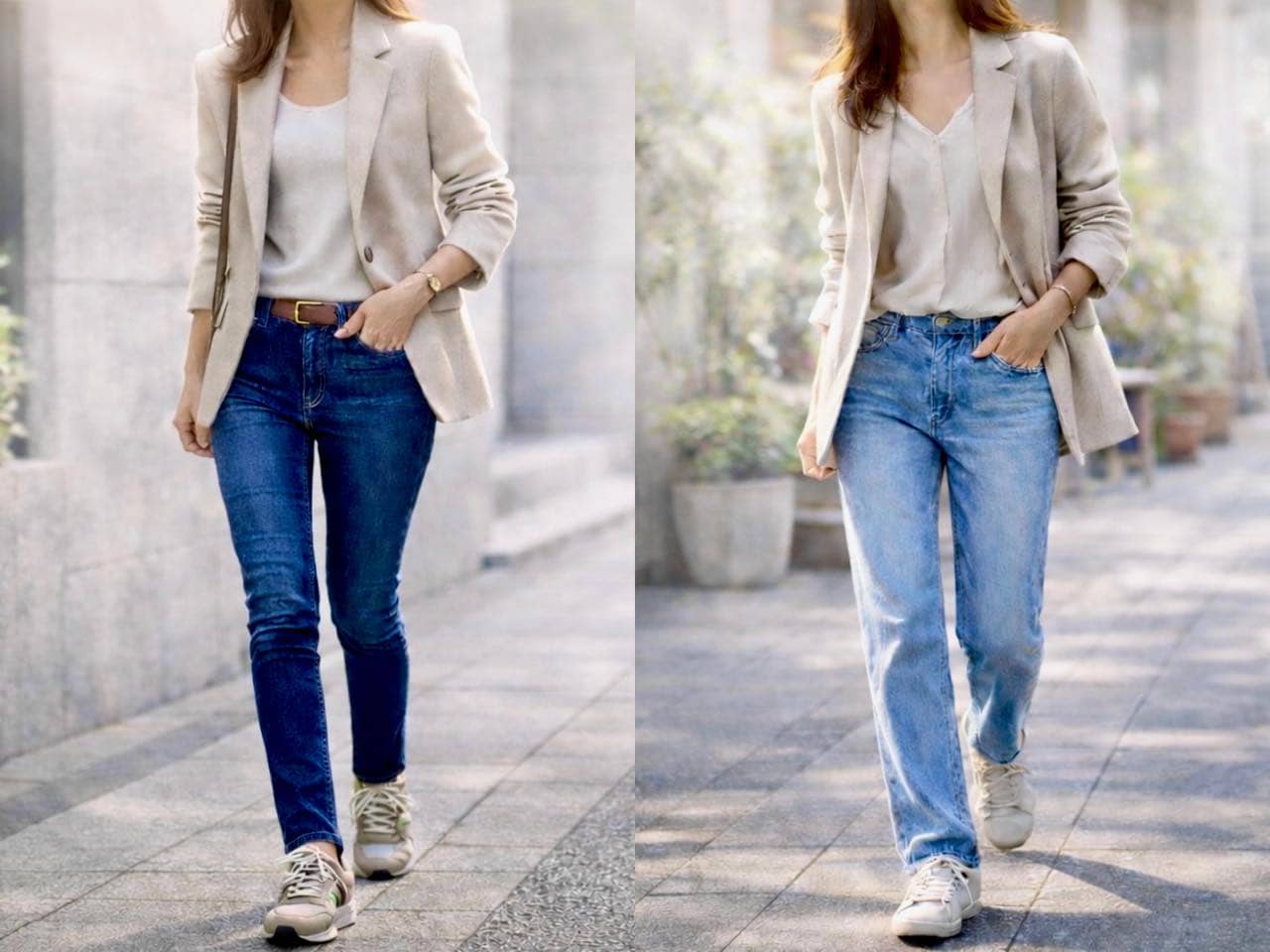 スキニーデニムは脚のラインをすっきり見せてくれる一方で、フィット感が強すぎると、全体のバランスが詰まって見えやすくなります。特にトップスにゆとりがある今のトレンドでは、ボトムだけが細いとコーデに違和感が生まれやすいもの。無理に細く見せるより、全体のシルエットを自然に整えることが大切です。