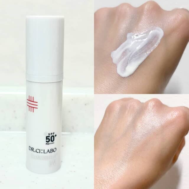 ▲ドクターシーラボ® クリニシールドUVスキンケア 30g ¥5,280(税込) SPF50+・PA++++ 耐水性★ ※価格は編集部調べ / (画像右上)白色の乳液のようなテクスチャー、(画像右下)なじませた後肌は白浮きなし