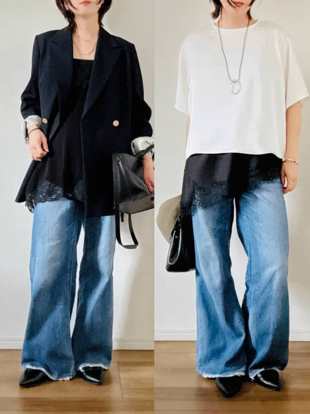 ジャケット×デニムの王道コーデも、インナーにレースキャミを重ねるだけで一気に印象が変わります。異なるテイストのアイテム同士をやわらかくつなぎ、抜け感と女性らしさを自然にプラス。また、トップスの裾からレースをほんの少しのぞかせるだけでも、シンプルな装いに奥行きが生まれます。視線が分散されることで、腰回りのカバーにもつながるのが嬉しいポイントです。