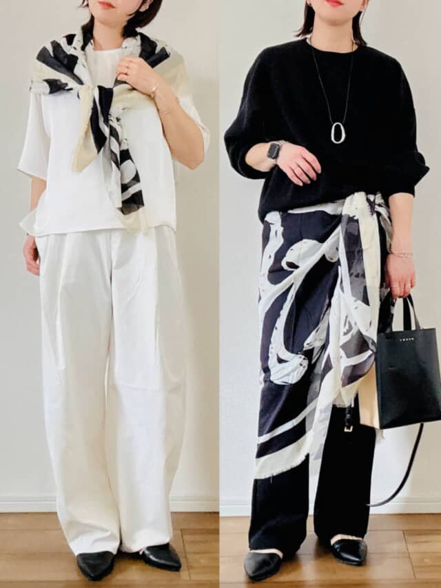 たとえばオールホワイトコーデ。洗練される一方で、単調に見えたり顔色がぼやけたりしやすいですが、スカーフを肩にラフに掛けるだけで立体感が生まれます。また、腰に巻くアレンジも有効。巻きスカート風に重ねることで、シンプルな装いに動きが出て、ヒップや腰回りも自然にカバーできます。柄を取り入れるハードルが高いと感じる人ほど、スカーフは取り入れやすい選択です。