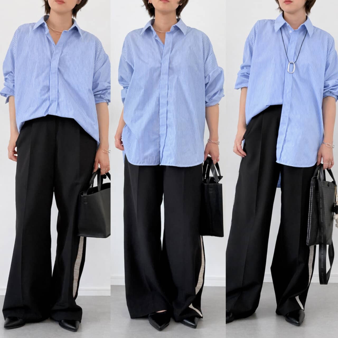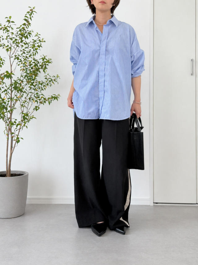 手首が見えることで、全体のバランスが軽やかに整い、抜け感が生まれます。ほんの少しの肌見せでも印象は変わるもの。シャツのきちんと感を残しつつ、やわらかさをプラスできるテクニックです。