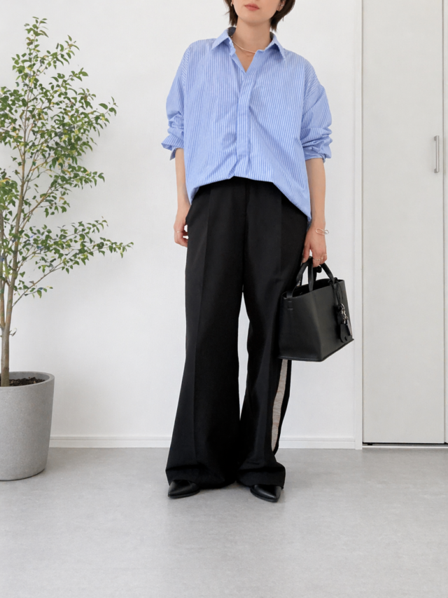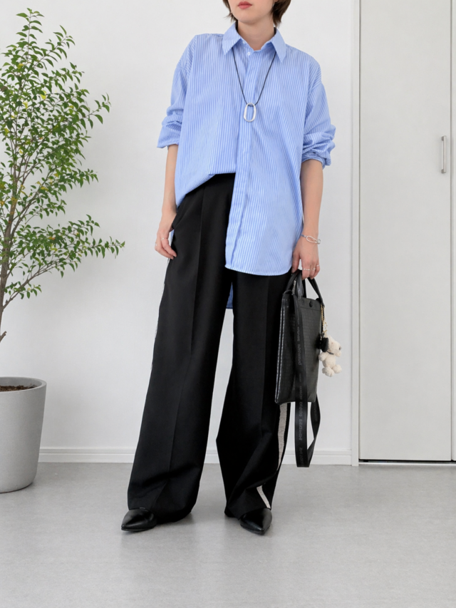 オーバーサイズのシャツを前だけインすると、どうしてもお腹周りがもたつきやすくなります。そんなときは、裾のボタンをあえて掛け違える方法がおすすめ。