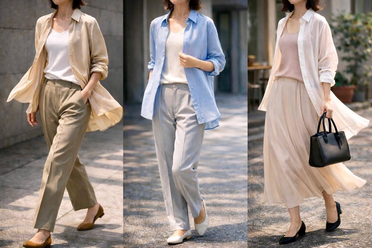 ▲シャツは“1枚で着ない”が今の正解。重ねて抜くことで、軽やかさと今っぽさが自然に引き出されます