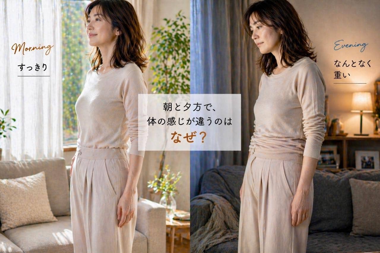 朝はすっきりしていたのに、夕方になるとなんとなく体が重く感じる。パンツのウエストや靴のフィット感が、朝と微妙に違う。そんな風に感じること増えていませんか?40代以降は、体重の増減とは別に「1日の中で体の見え方や感覚が変わる」ことが増えていくもの。その仕組みを知ると、見え方を整えやすくなります。