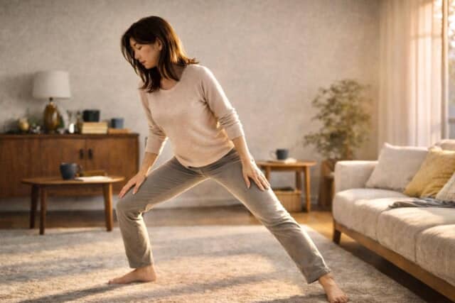 軽く膝を曲げた状態でスタートし、横に一歩踏み出す→戻すを繰り返す(左右各10歩×2セット)