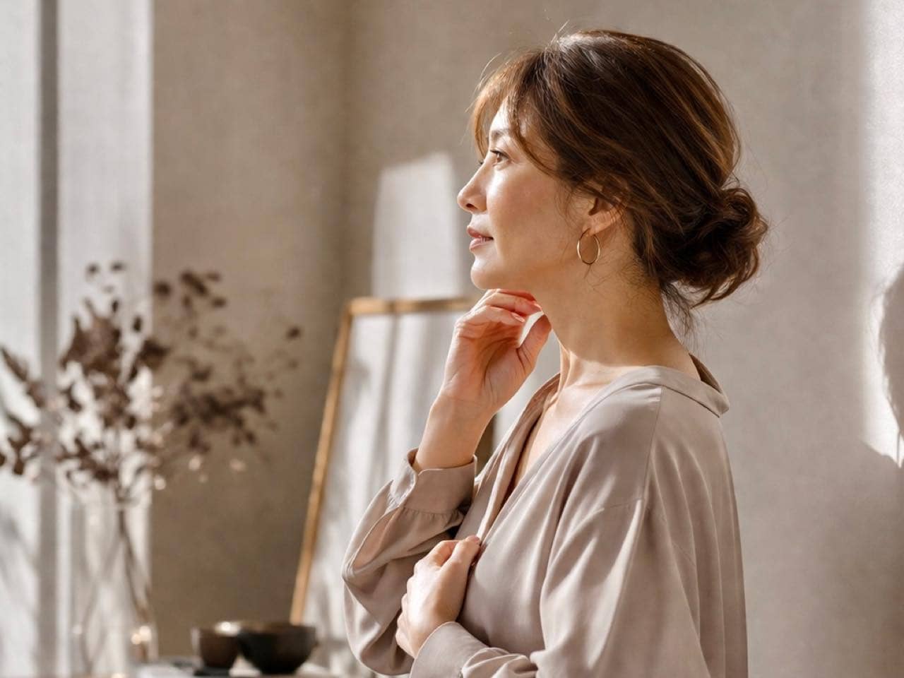 首元とフェイスラインを整えるには、特別なケアよりも“位置を戻す意識”が重要。頭の位置を体の中心に乗せるように意識するだけでも、首まわりの負担は軽減され、ラインがすっきりしやすくなります。また、長時間同じ姿勢を続けず、軽く首や肩を動かすことも効果的です。
