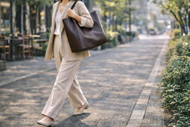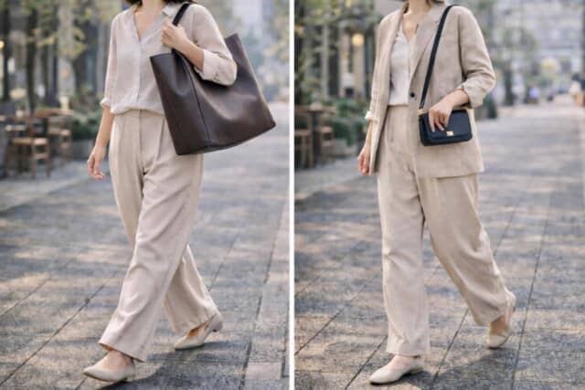 一方で、レイヤードスタイルや少しボリュームのあるコーデには、大きめバッグがしっくりくるでしょう。ジャケットやしっかりした素材の服と合わせることで、全体に安定感が生まれます。 ▲ボリュームのあるコーデには、大きめバッグで重心を整えると安定感が出る 大きめバッグは視覚的な重さが出る分、コーデの重心を下げてくれる役割も。結果として、落ち着いた印象やまとまり感につながります。