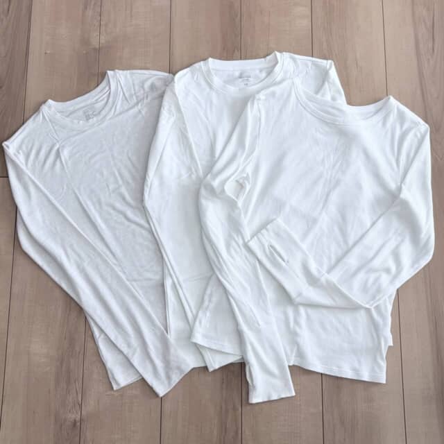 白インナーといっても、透け感や素材、首元の見え方など、雰囲気はそれぞれ異なります。まずは3枚を見比べて、どんな服と相性が良さそうかイメージしてみましょう。