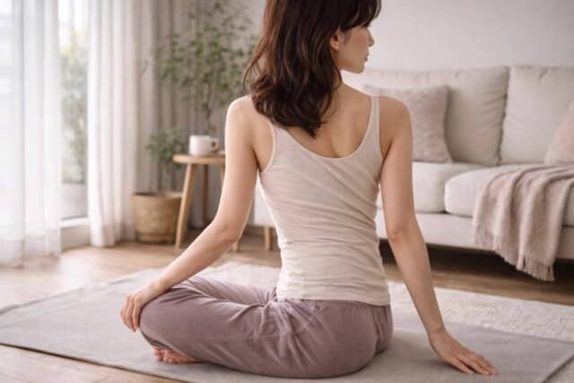 Rさんが意識したのは、「鍛える」よりも姿勢を整えること。起床後すぐ、呼吸に合わせて体を伸ばすシンプルなヨガを取り入れました。前屈や軽いねじり、背筋を伸ばす動きなど、強度は低め。それでも朝に体を動かすことで、背中や肩まわりがすっと軽くなり、自然と姿勢を意識しやすくなったそうです。