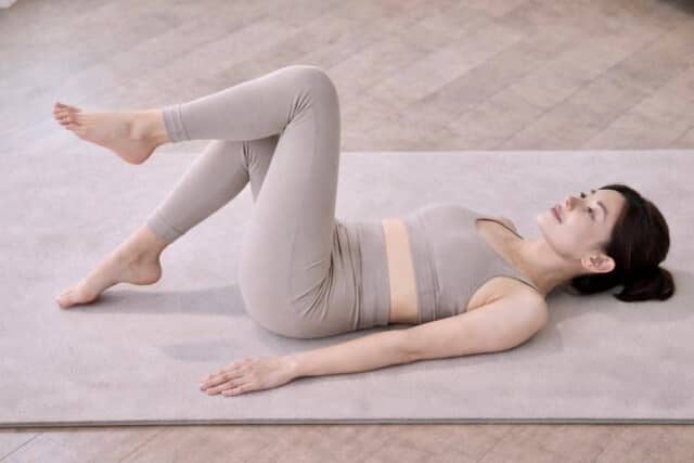 仰向けになり、股関節とひざを直角に曲げてテーブルトップポジションをつくります。腰が反らないよう背中をやさしく床に預け、下腹を軽く引き込む意識で。まずは“動かない土台”を整えます。