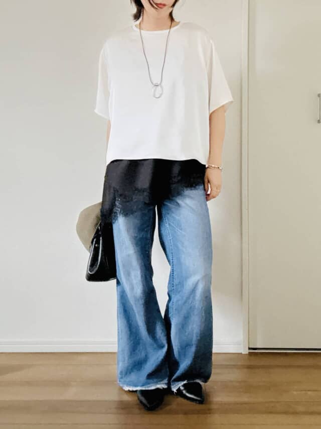 定番の「白トップス×デニム」も、サテン素材に変えるだけで印象が一変。ラフなデニムとツヤのあるトップスの対比が、自然とこなれた雰囲気を作ってくれます。