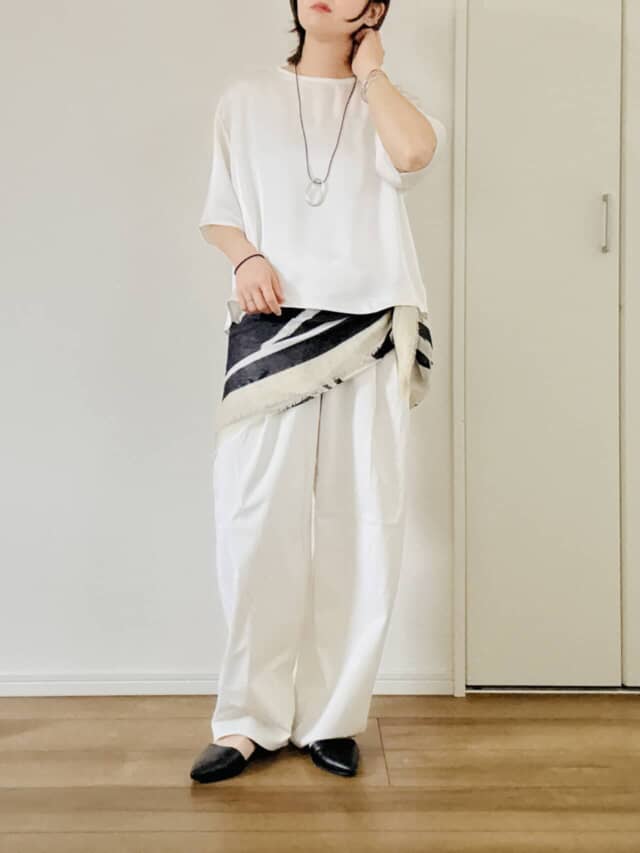さらに小物で引き締めるのもポイント。黒のシューズやスカーフをプラスするだけで、全体がぼやけずメリハリのある印象に仕上がります。
