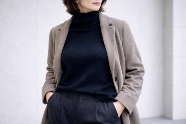 タートルネックは首元をしっかり覆うため、黒を選ぶと顔のすぐ下に濃い色が集まります。さらにアウターやボトムまで暗色が続くと、光の入り場が少なくなり、表情や輪郭の立体感が弱まりがちに。