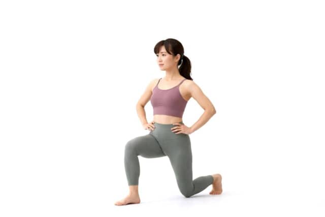 片脚を一歩前に踏み出し、前脚のひざが約90度になるまでゆっくり体を下ろします。上半身は起こしたまま、腰が反らない位置をキープ。後ろ脚は自然に伸ばします。